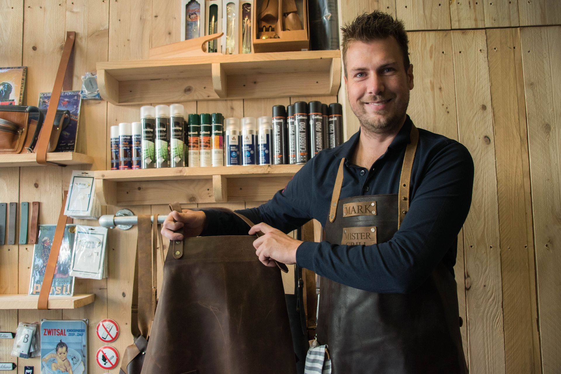Met passie en enthousiasme maakt Mark van Heeswijk leren schorten en sloven naar wens van de klanten. Door de ruime variatie in kleur, type zakken, hengsels en de mogelijkheid om het bedrijfslogo aan te brengen zijn de producten altijd op maat.